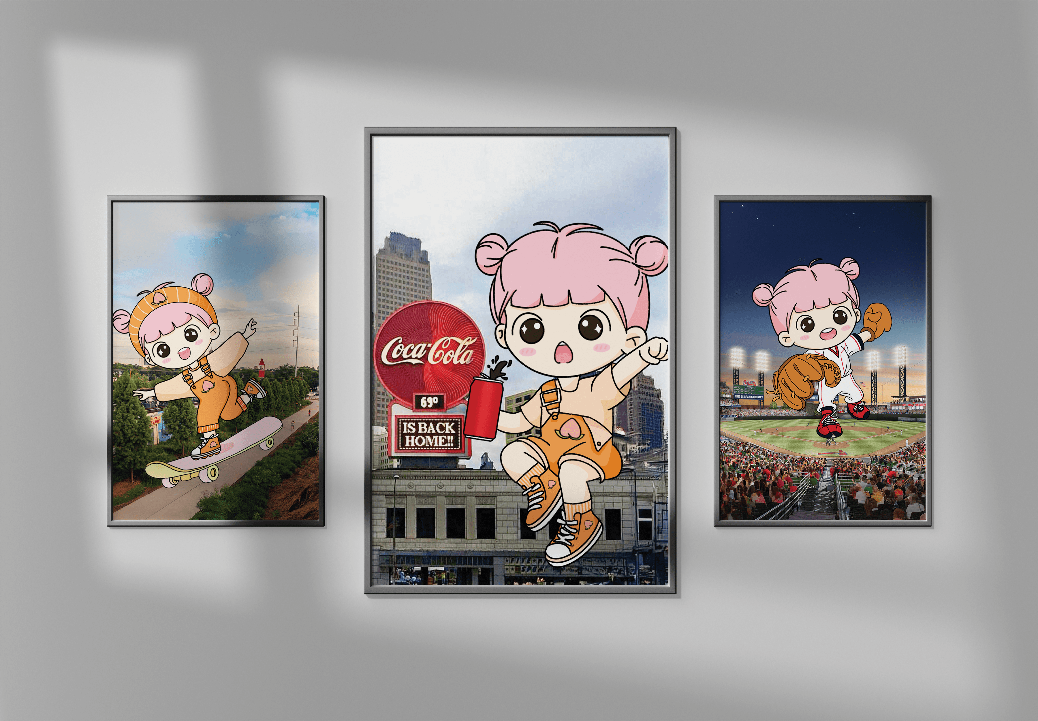 For submission to an Atlanta-based print shop, the artwork needed to highlight recognizable city landmarks while maintaining a strong, cohesive character identity. The key objective was to seamlessly integrate my original illustrated character into real photographs of Atlanta’s major locations, ensuring that the character felt naturally embedded within each environment rather than visually detached.