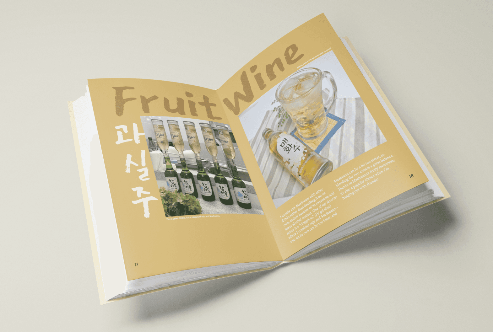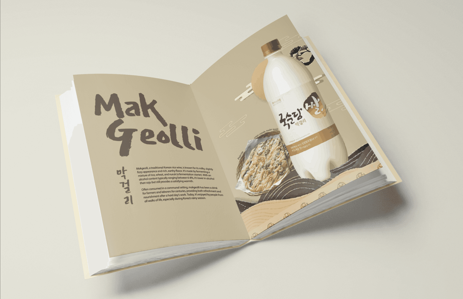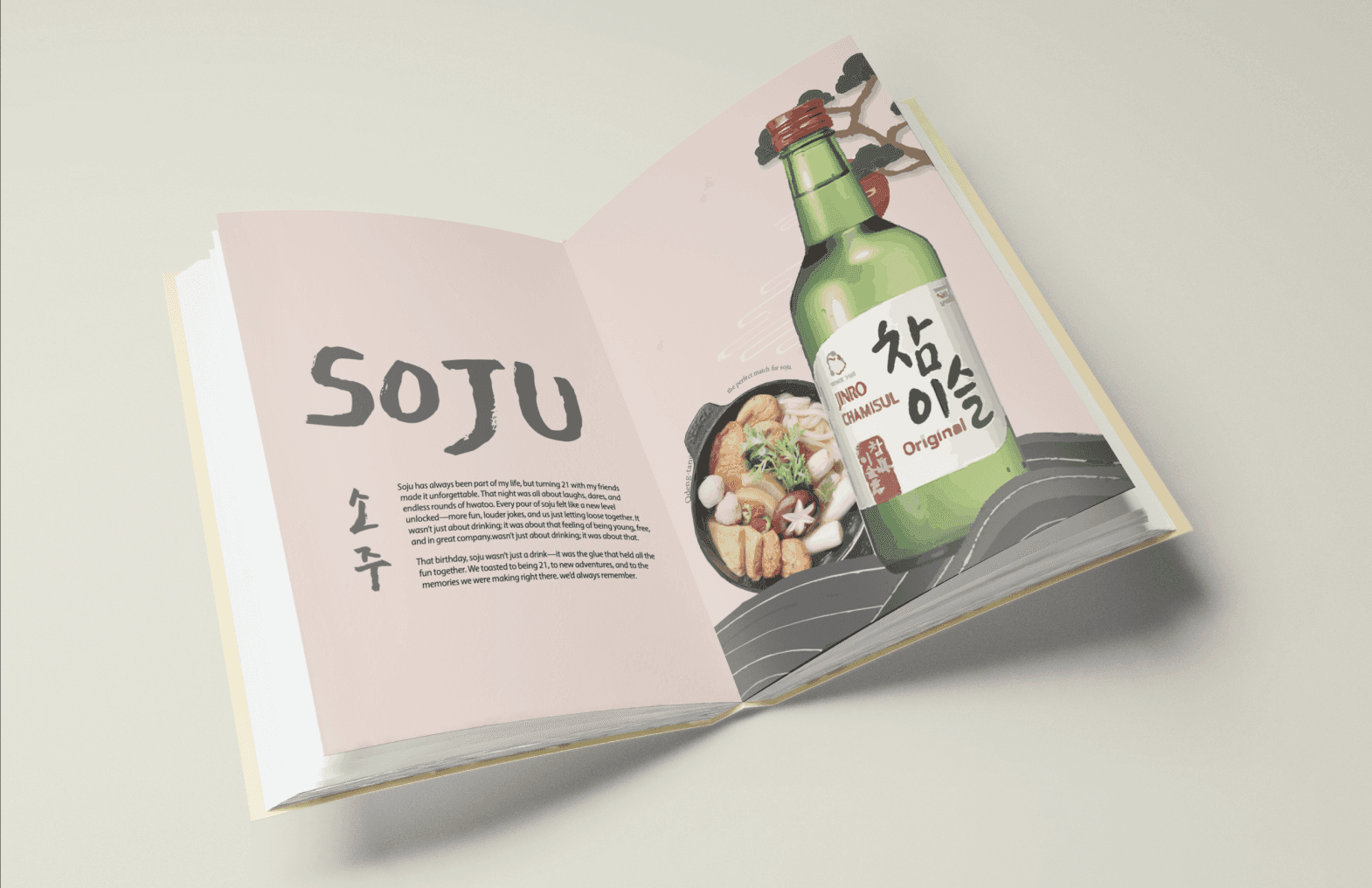 This project is a collection book that introduces Korean alcoholic beverages through editorial design and visual storytelling. The book explores the cultural background, drinking traditions, and atmosphere in Korean alcohol, presenting them in a curated, contemporary format that balances tradition and modern sensibility.