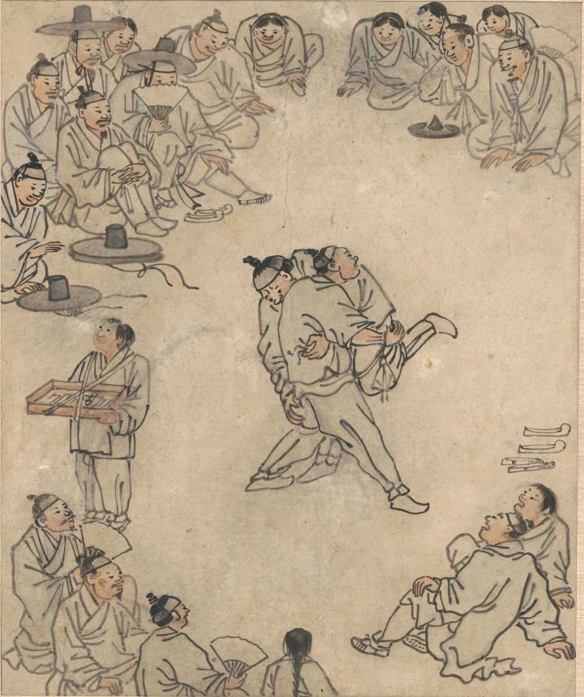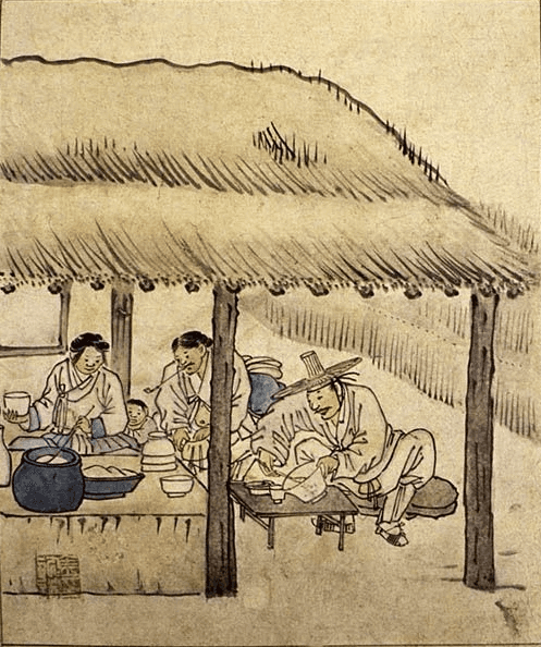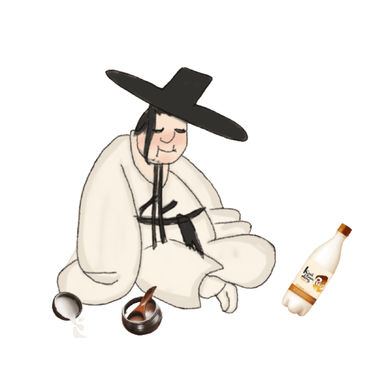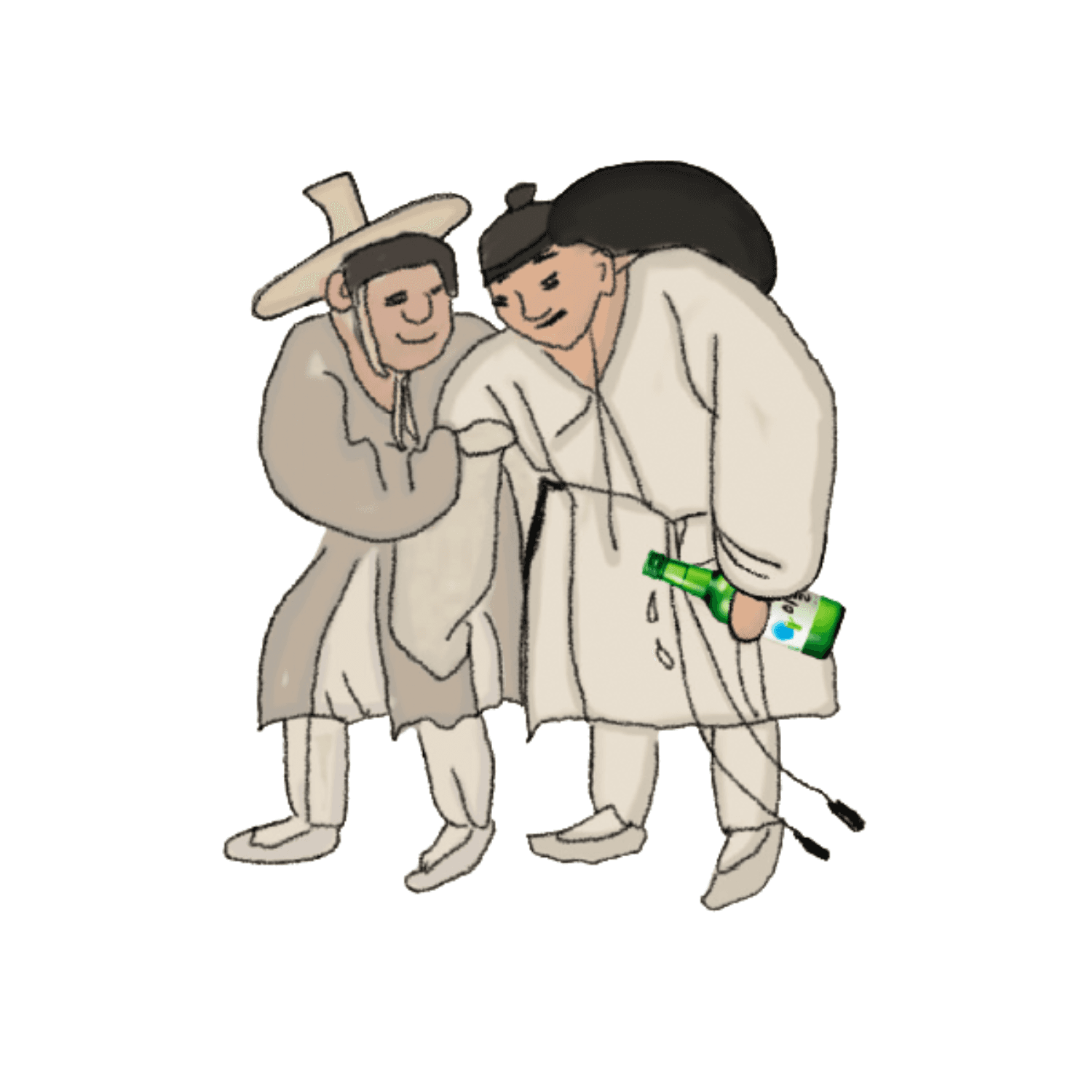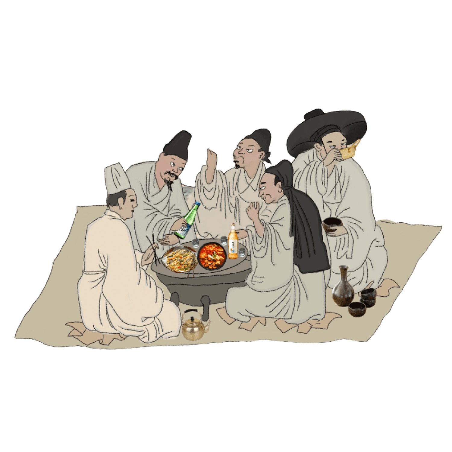 The illustrations are inspired by traditional Korean paintings and folk imagery, reinterpreted with hand-drawn lines and subtle textures. Characters, scenes, and objects are illustrated to evoke everyday moments of sharing drinks, emphasizing warmth, humor, and cultural narrative rather than realism.
