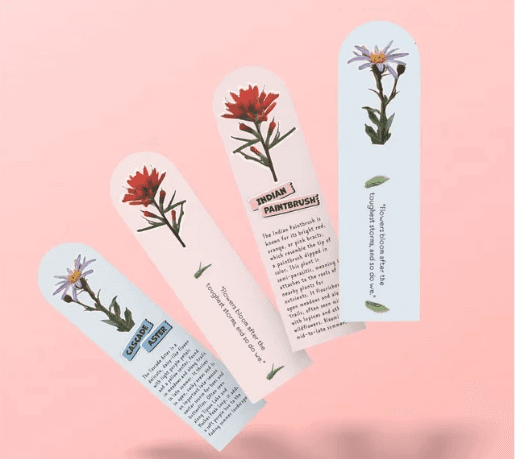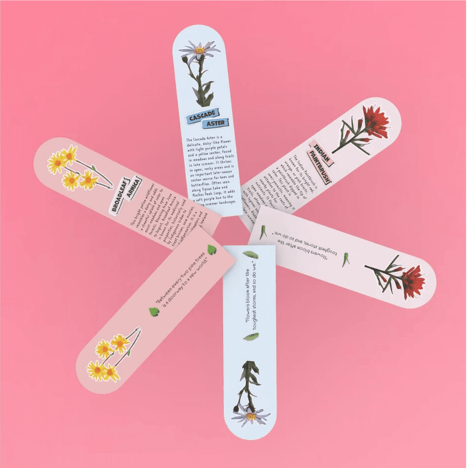 Inspired by native wildflowers found in Mount Rainier National Park, this interactive bookmark set highlights plants such as the Cascade Aster and Indian Paintbrush. Each petal shaped bookmark features a botanical illustration and a short fun fact to educate and engage readers. Designed to fan out like a flower, the set functions as both a practical reading tool and a playful keepsake for nature lovers and park visitors.