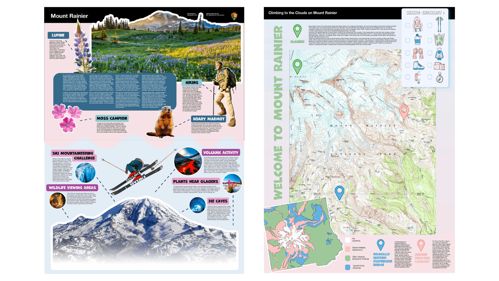 This project reimagines informational materials for Mount Rainier National Park using the National Park Service Unigrid system as a foundation. The redesign maintains the core Unigrid structure, such as the black header bar and column based layout, while updating the visuals for a more modern, engaging, and visitor friendly experience. Custom icons, color accents, and reorganized content improve clarity, readability, and navigation, making park information easier to understand for first time visitors while staying true to the Unigrid.