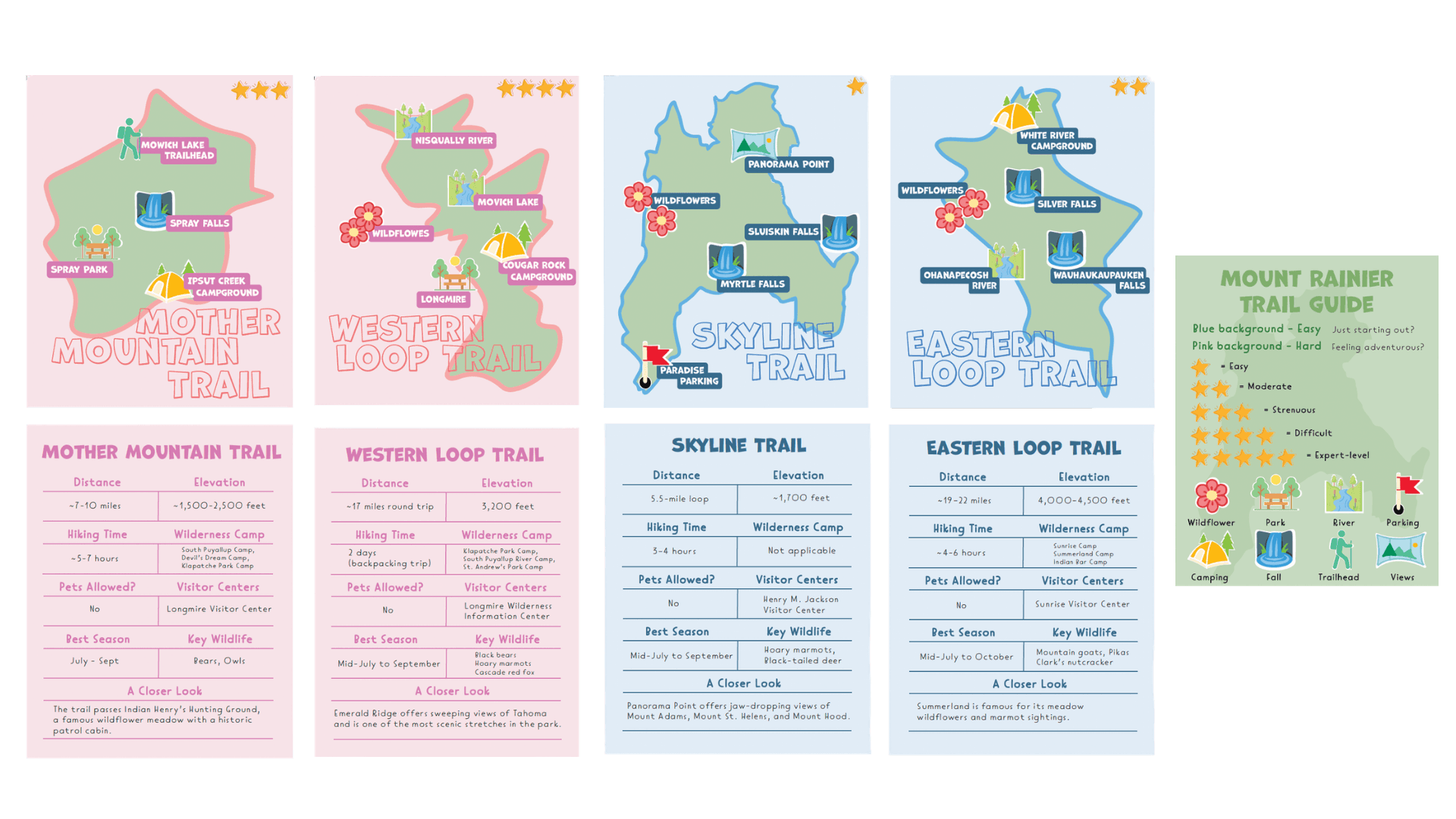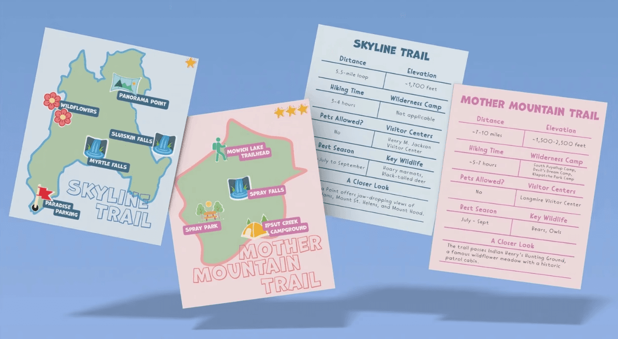 This trail guide set includes illustrated maps and quick reference information cards for two popular hikes, Skyline Trail and Mother Mountain Trail. Designed with first time hikers in mind, each card clearly presents trail distance, elevation, key stops, pet policies, and seasonal tips.