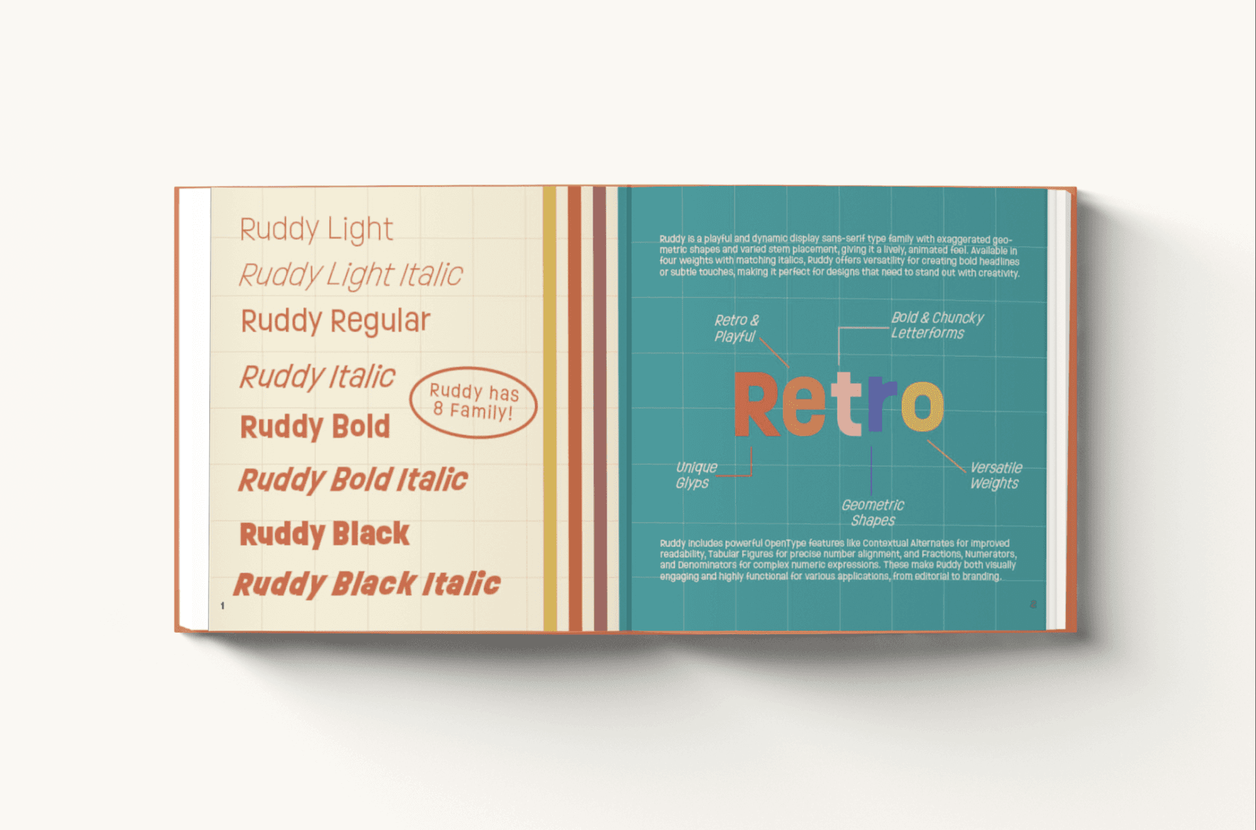 Ruddy is an expressive typeface with multiple weights and styles that balance character and readability. Its organic strokes and playful details give the type a warm, energetic tone, while its structured forms allow it to function effectively in both display and text settings. Ruddy’s versatility makes it suitable for editorial layouts, branding, and digital experiences.