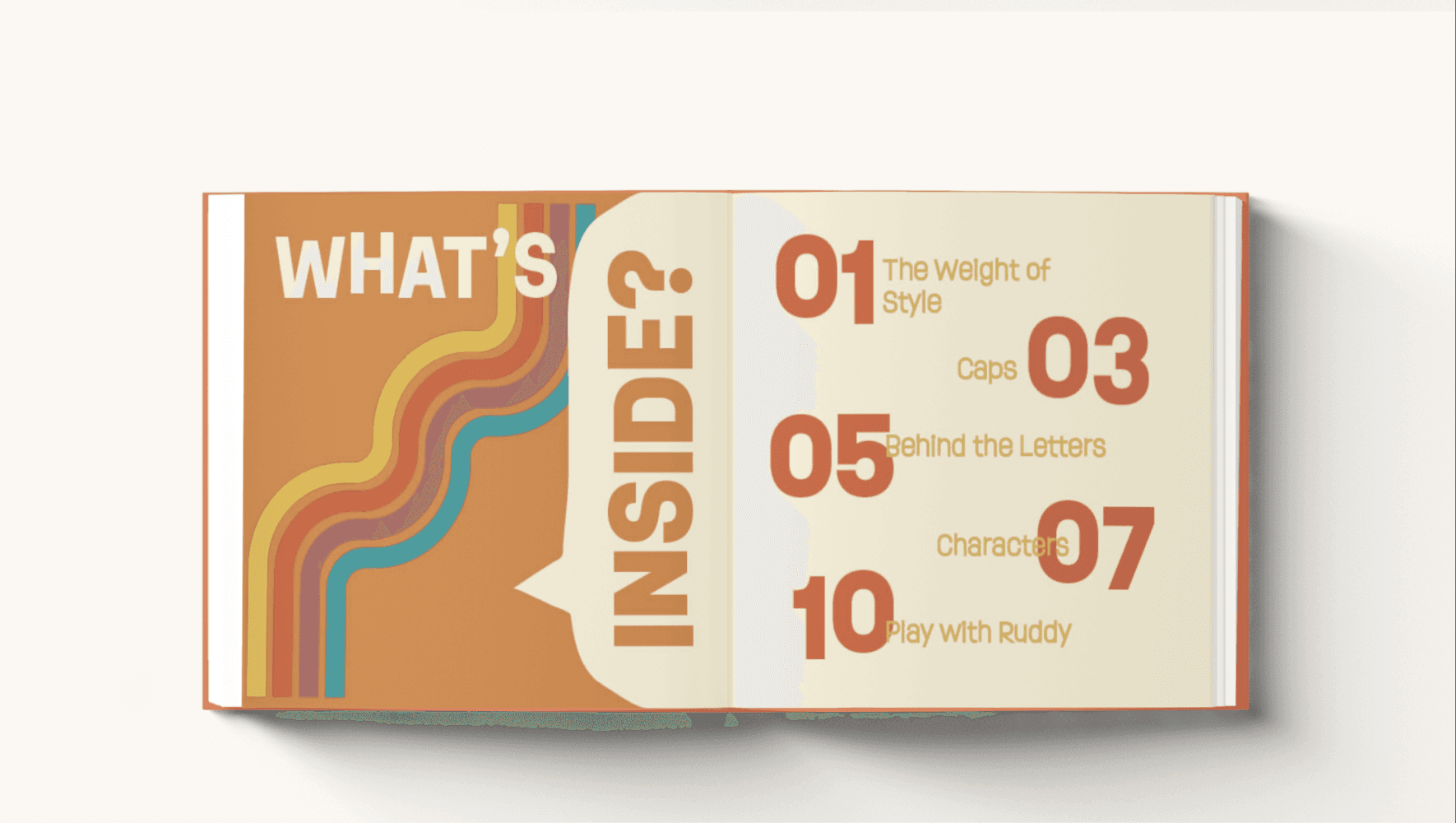 The online eBook version of the Ruddy type specimen was designed as an animated, interactive experience rather than a static document. Motion was used to guide viewers through the type system, highlight transitions between sections, and emphasize typographic details such as weight changes and hierarchy. Subtle animations bring the type to life, reinforcing Ruddy’s energetic personality.